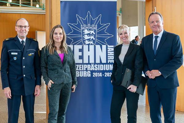 Von links: Polizeipräsident Franz Semling, Boxweltmeisterin Regina Halmich, Laura Riske (Leiterin Stabstelle Öffentlichkeitsarbeit) und Polizeivizepräsident Matthias Zeiser.